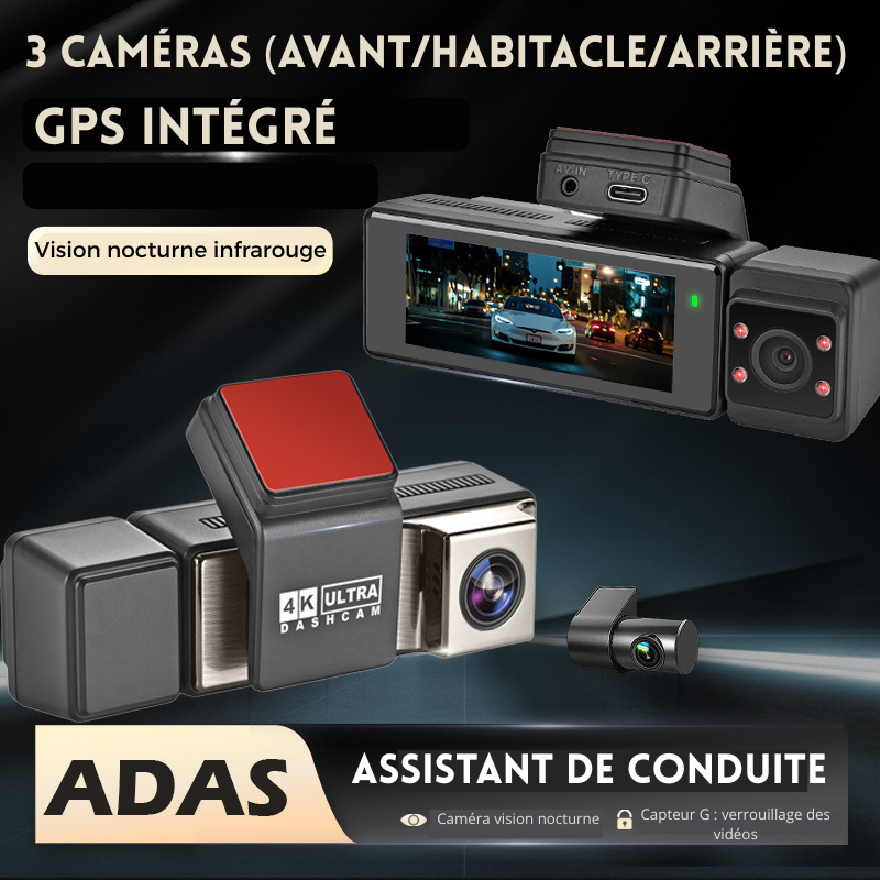 Caméra embarquée voiture (dashcam) 3 caméras 4K – Avant/Arrière/Cabine Infrarouge – GPS, Wi-Fi, ADAS, G-Sensor